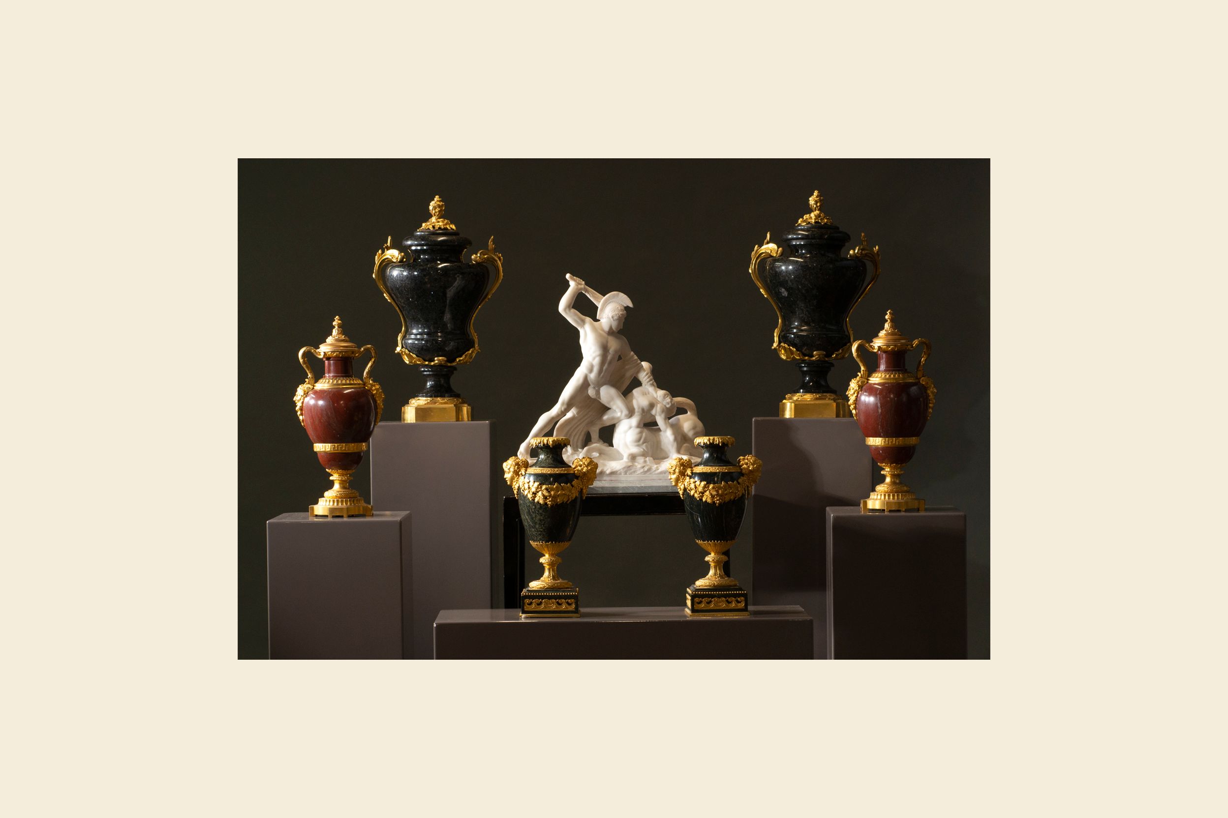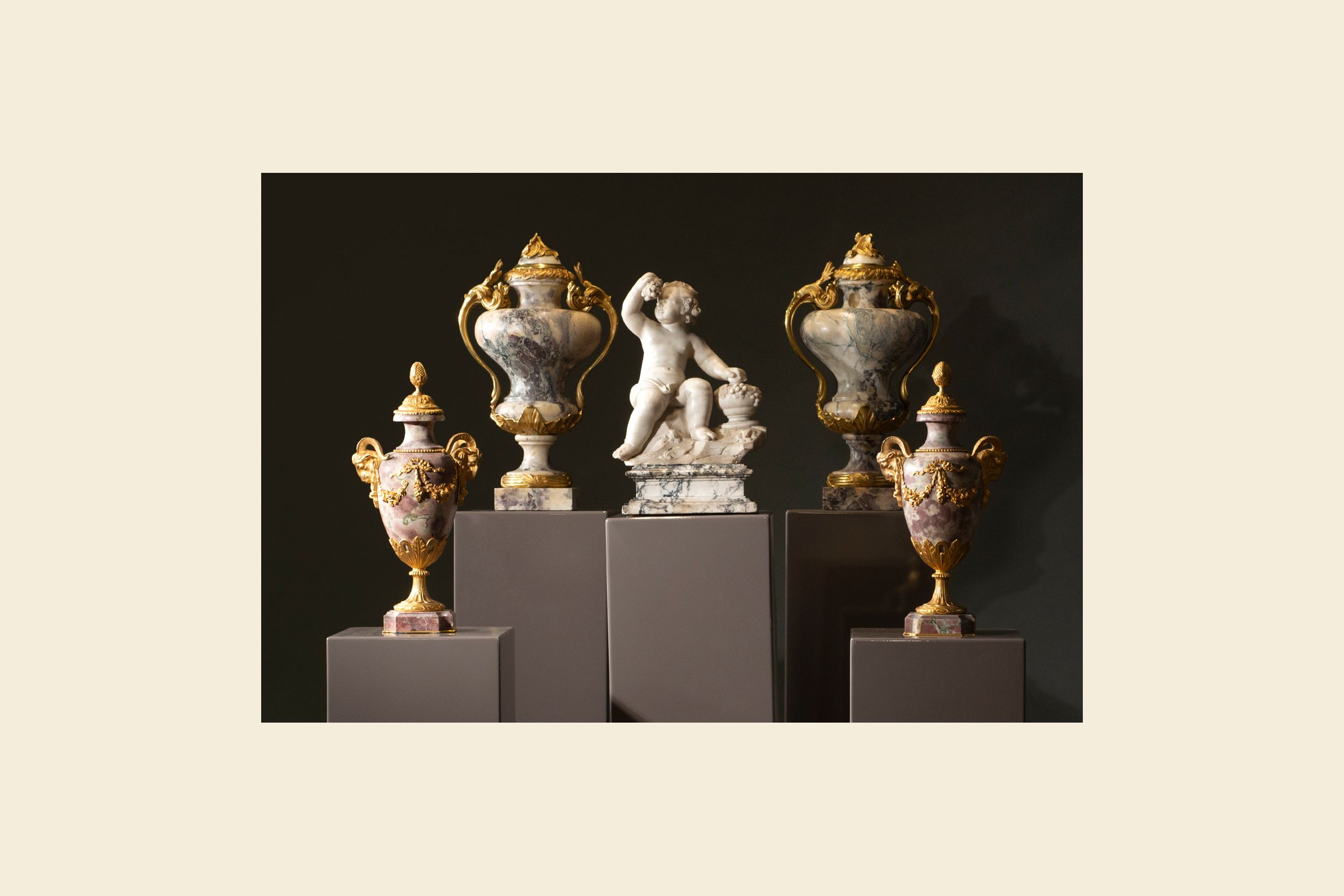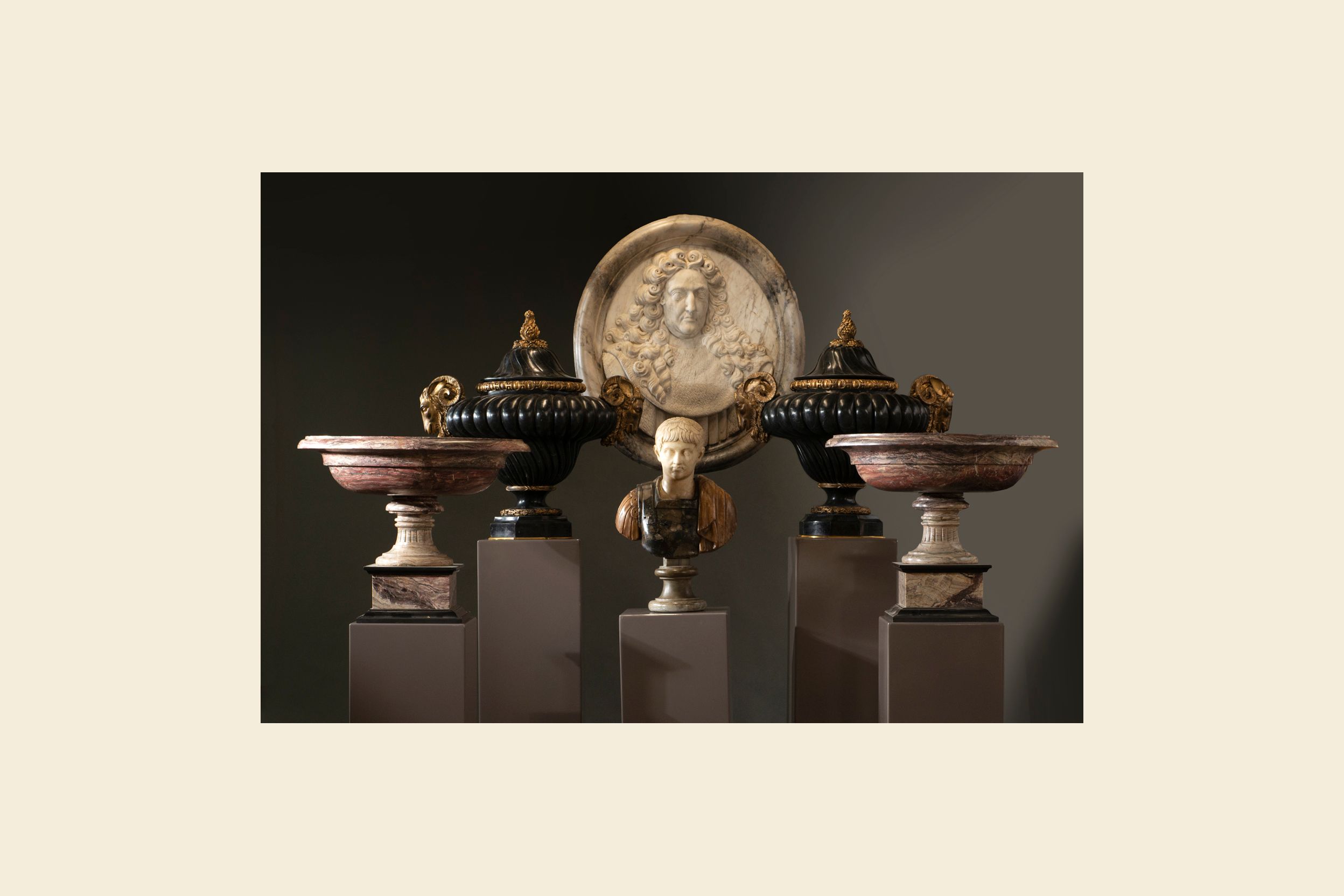 in the foreground a 17th century marble platter and to the left an early 19th century canvas.