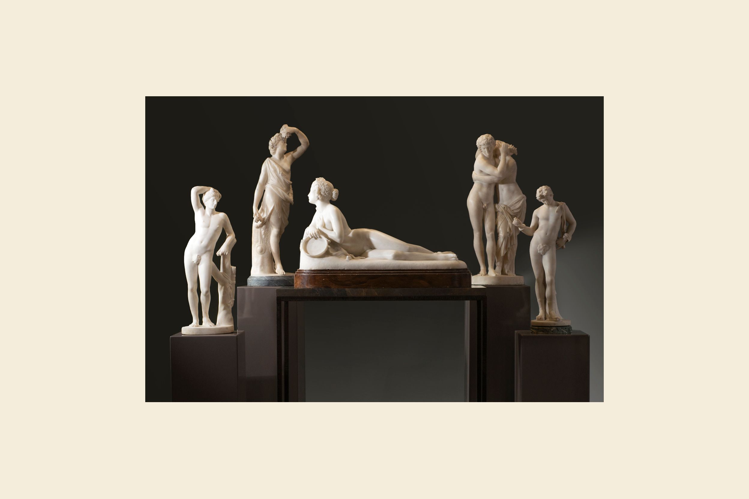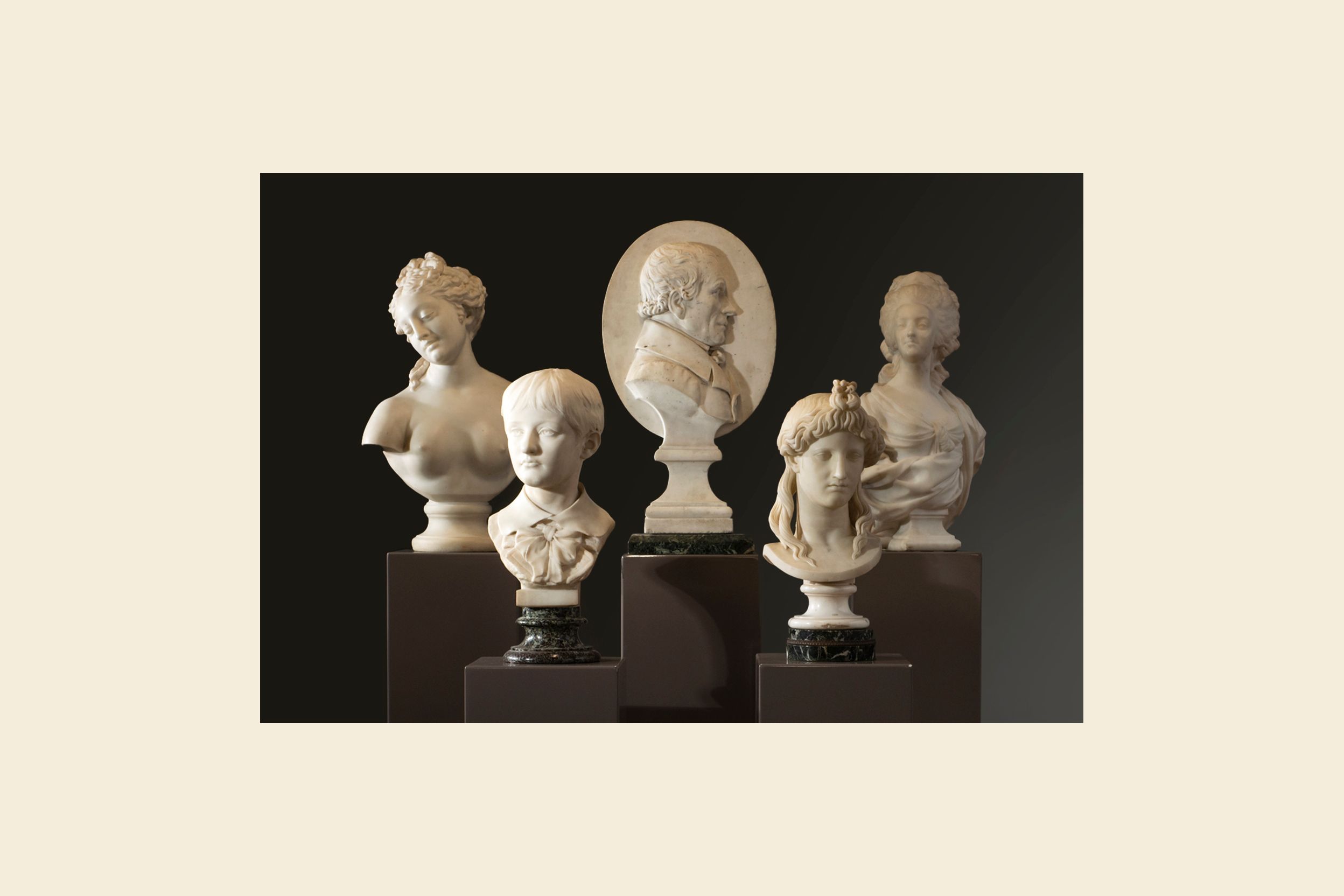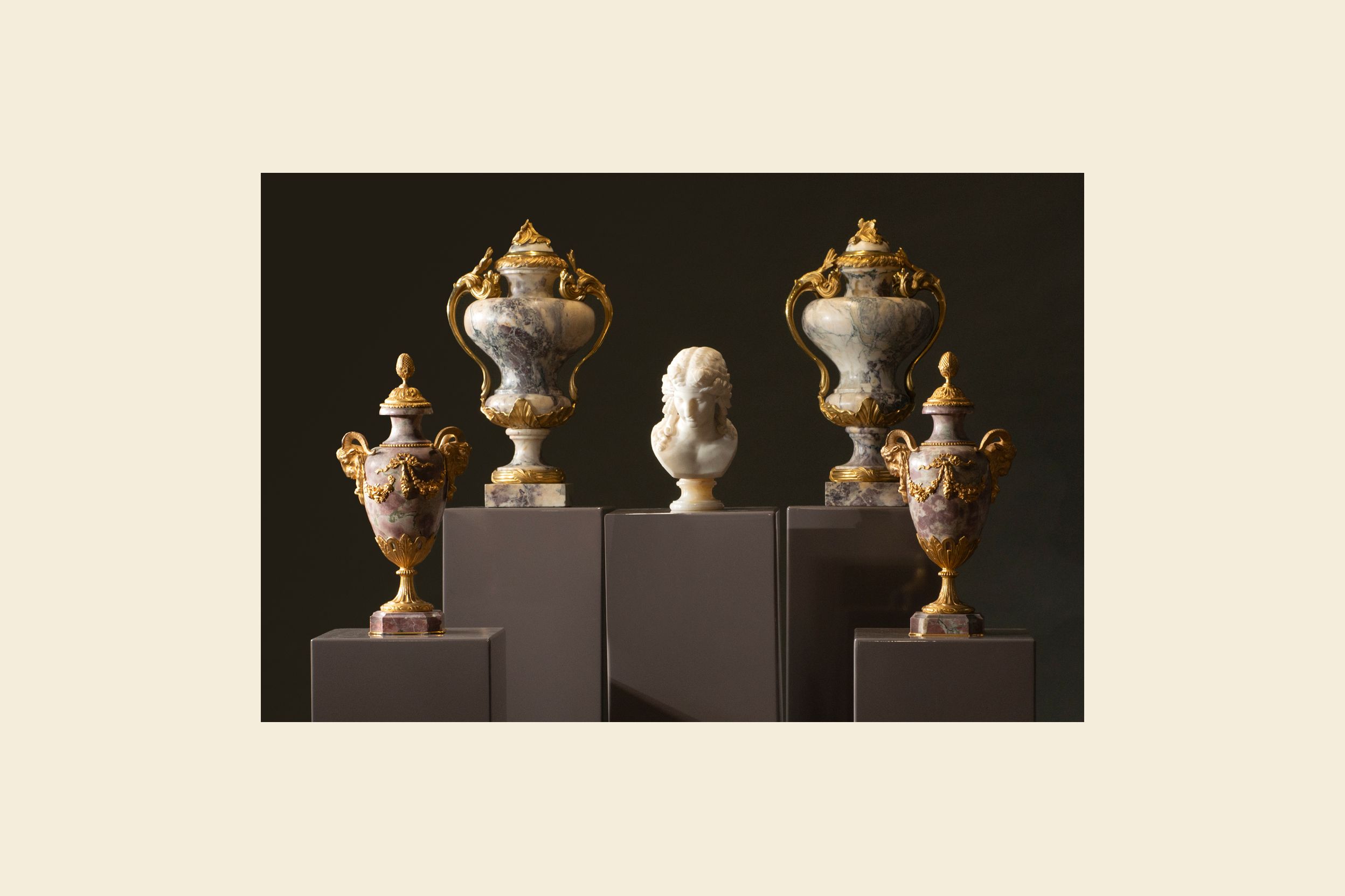 in the foreground a 17th century marble platter and to the left an early 19th century canvas.