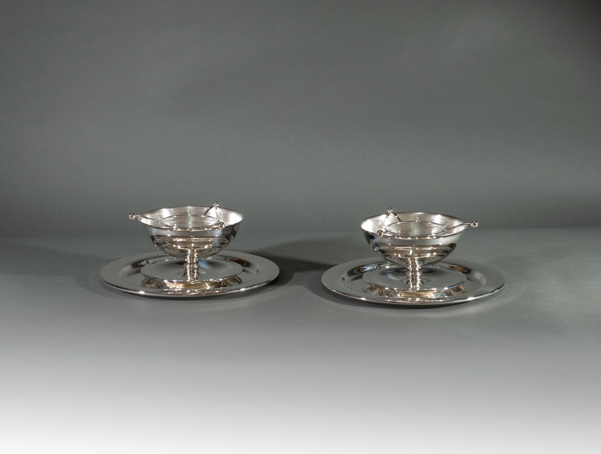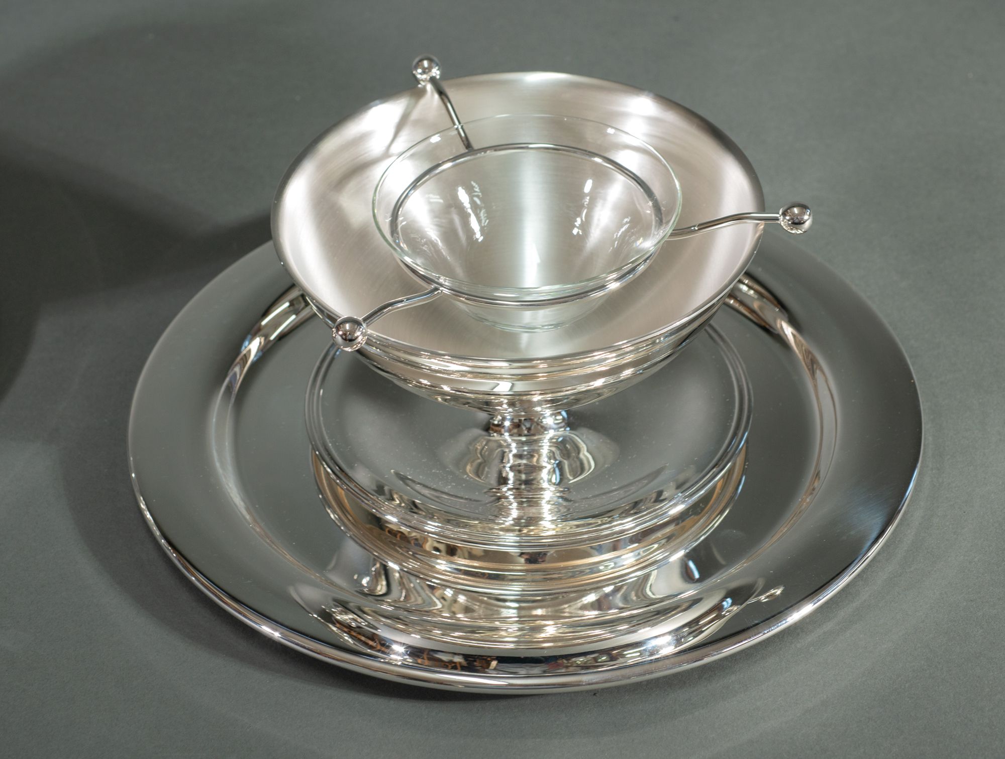 2 bols à caviar en métal argenté composé d'un plat d'une coupe et d'une coupelle en verre