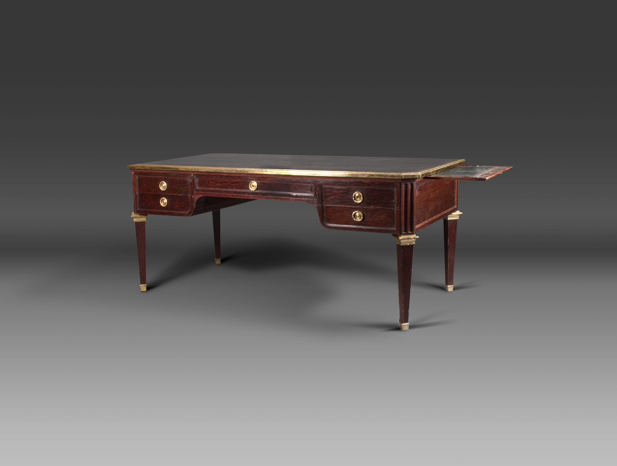 Large mahogany desk with a black leather tray surrounded by a border of bronze, with five drawers on four legs with a jacket , Louis XVI style.