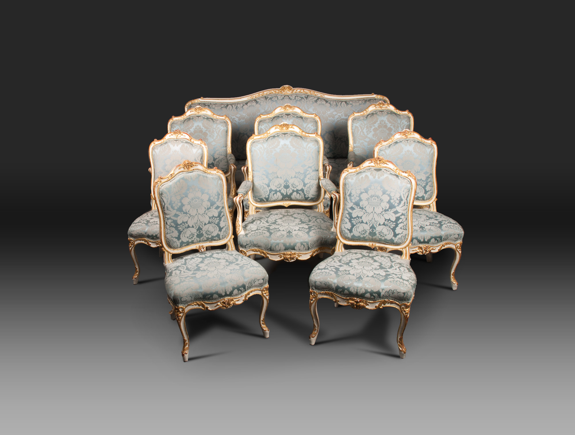 White lacquered and giltwood Louis XV sofa with light blue silk damask.