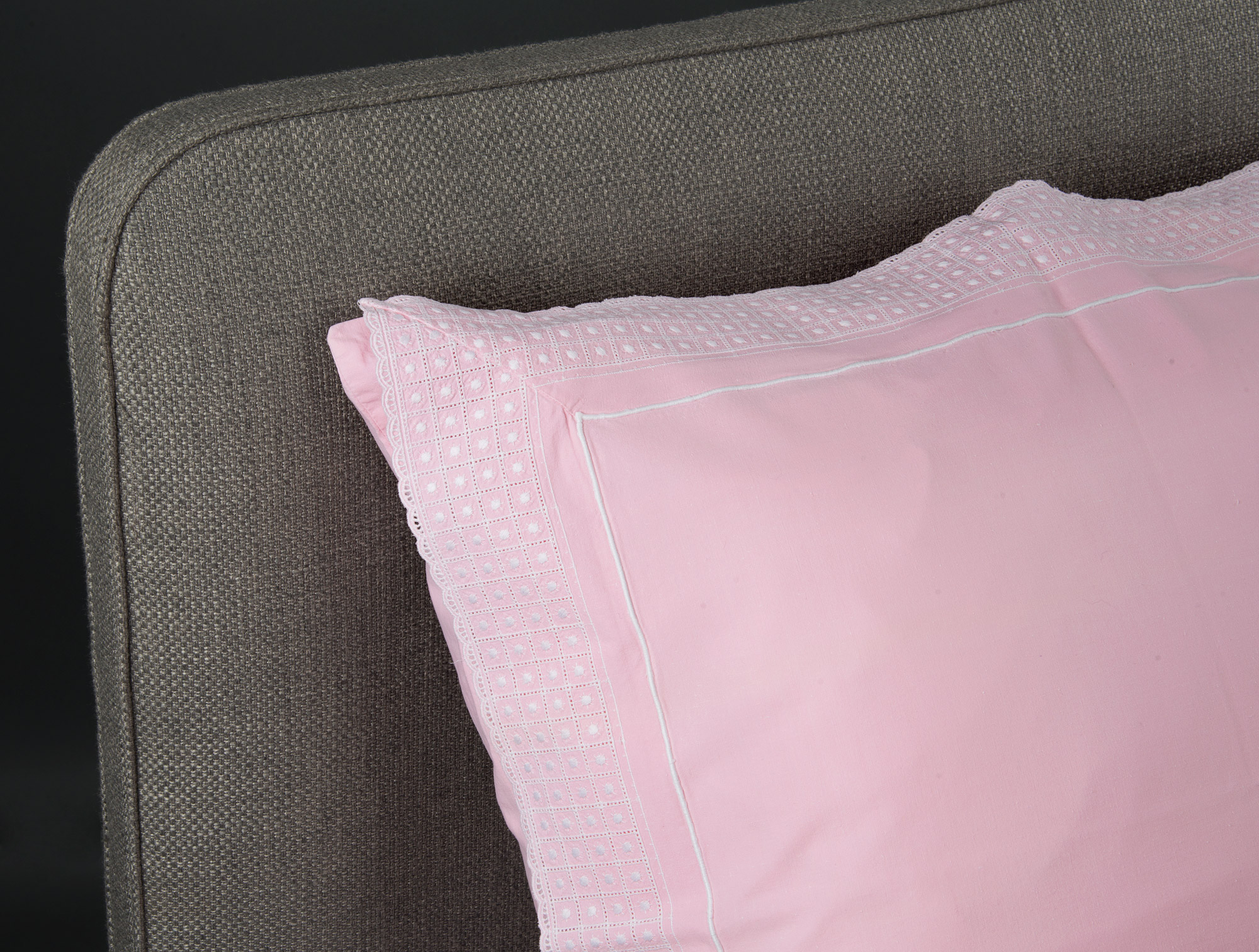 Pink top sheet with white lace lining and its 2 pillowcases (60x60cm).