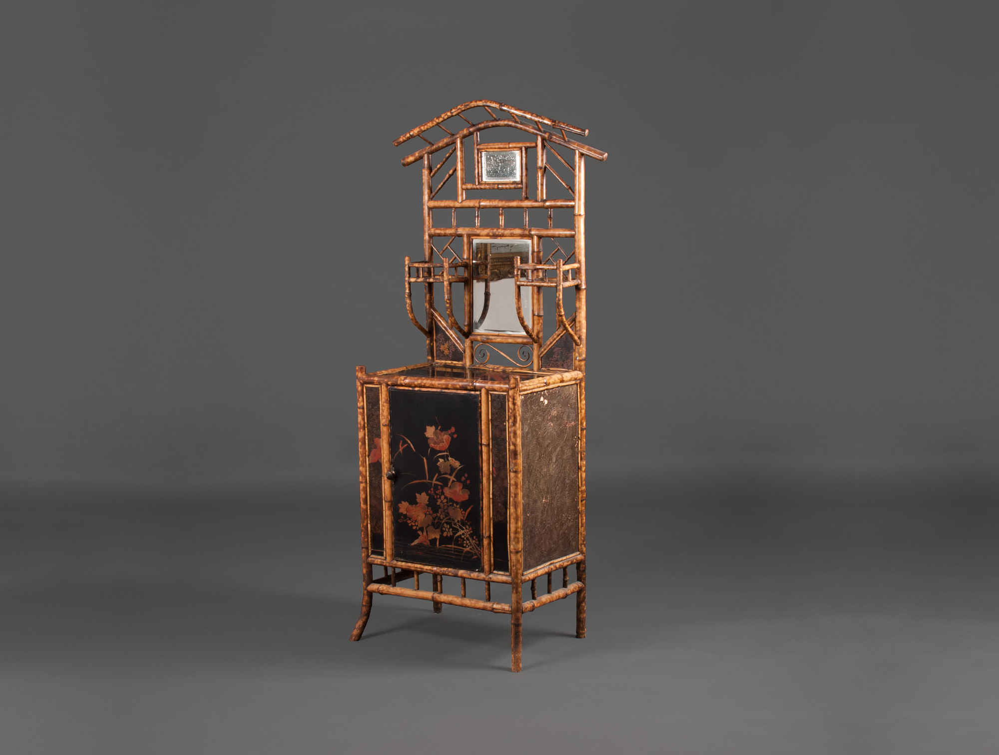 Black lacquered mirror bamboo dressing table with polychrome floral decoration.