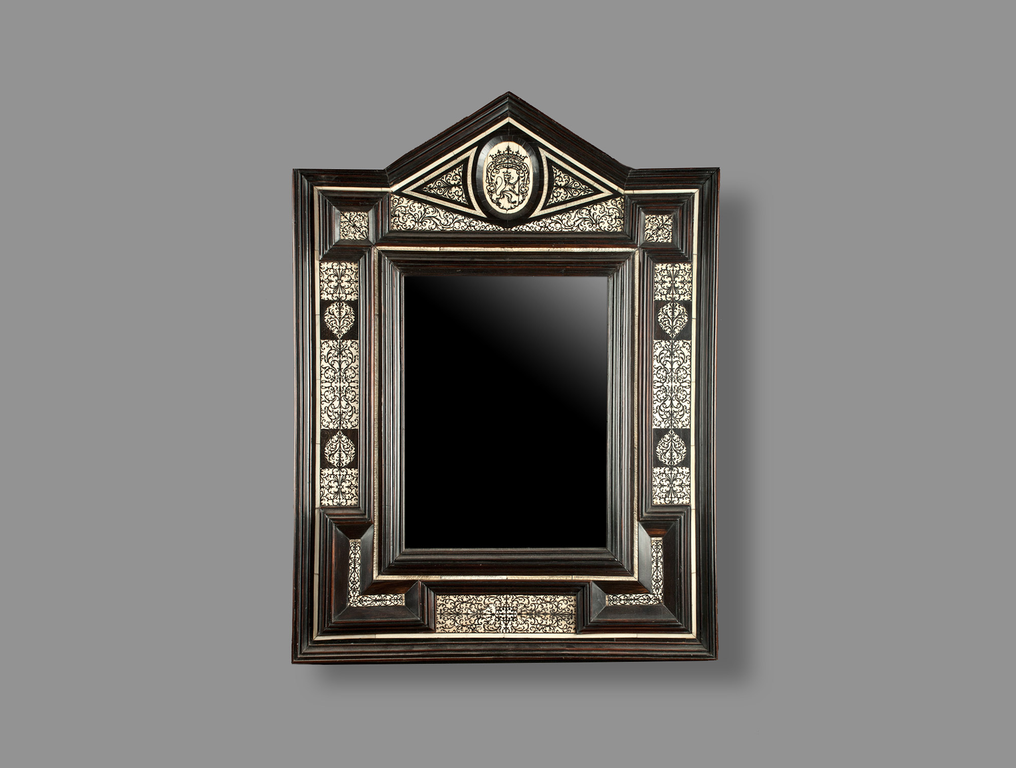 Wooden mirror blackened triangular pediment with inlaid bone seventeenth .
