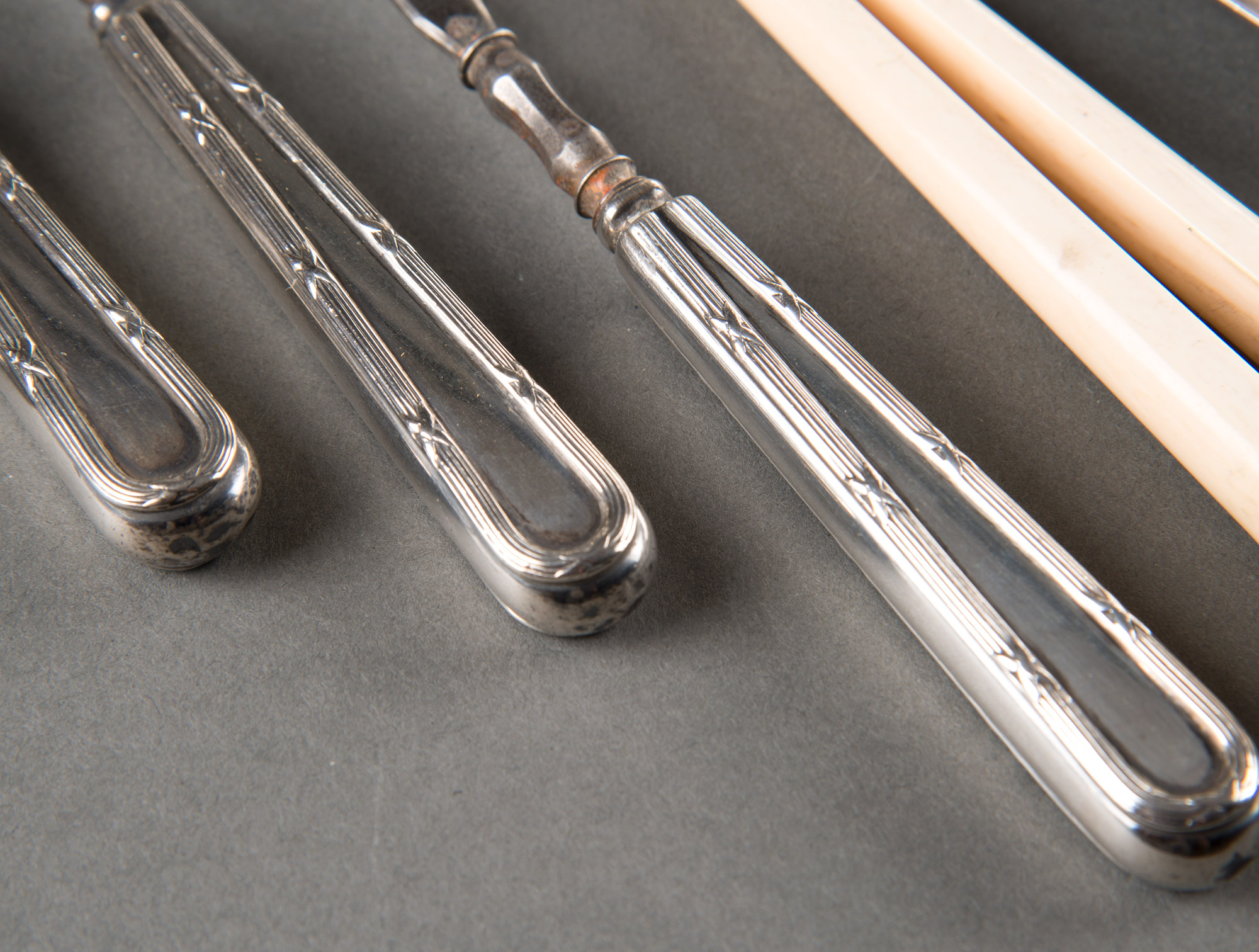 Crystal and silver toilet set comprising 4 bottles, 2 powder compacts, 2 boxes, 3 hair brushes, 2 clothes brushes, and other items.