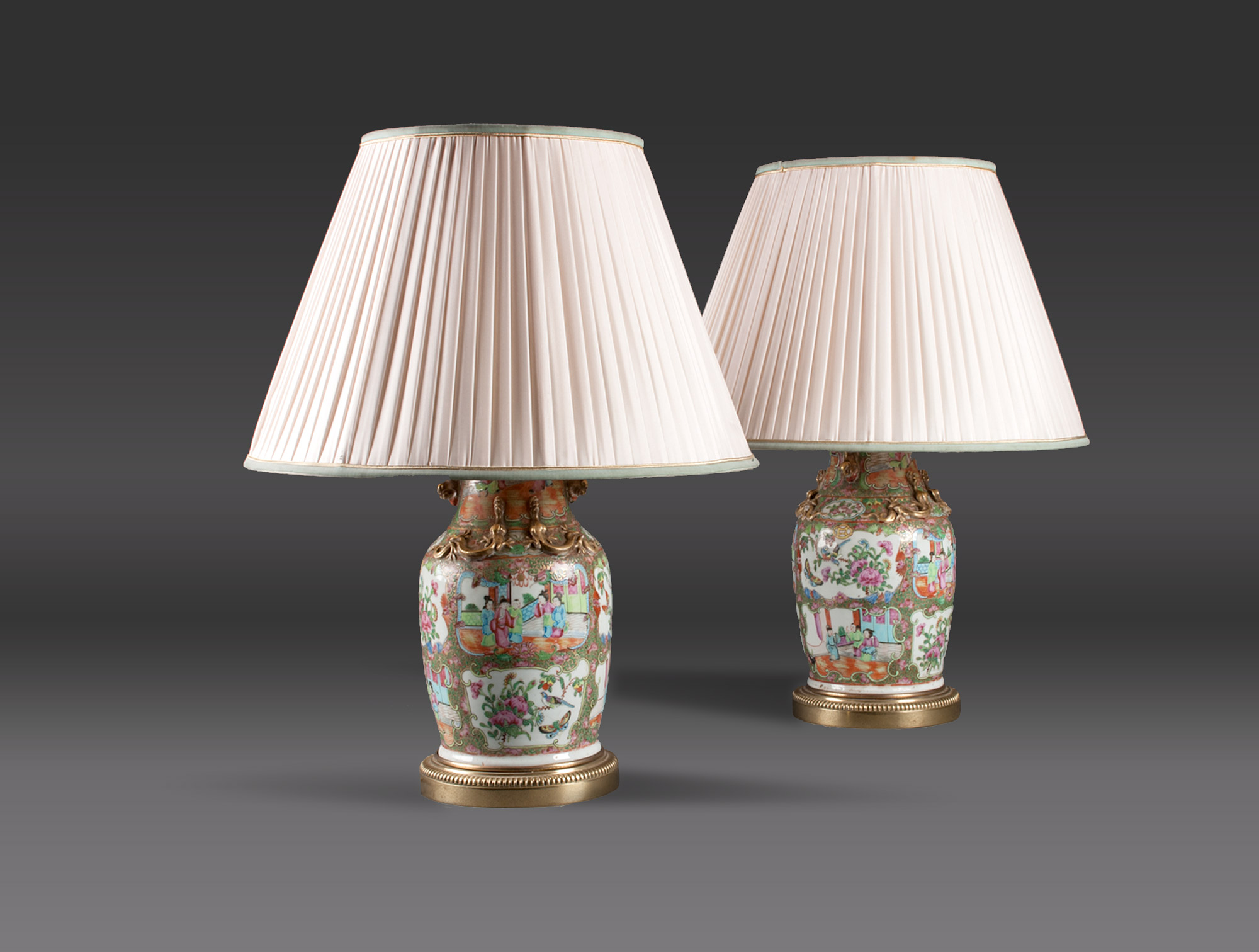 Two earthenware lamps Chinese vases decorated with flowers and figures, topped by a white pleated shade , nineteenth - China.