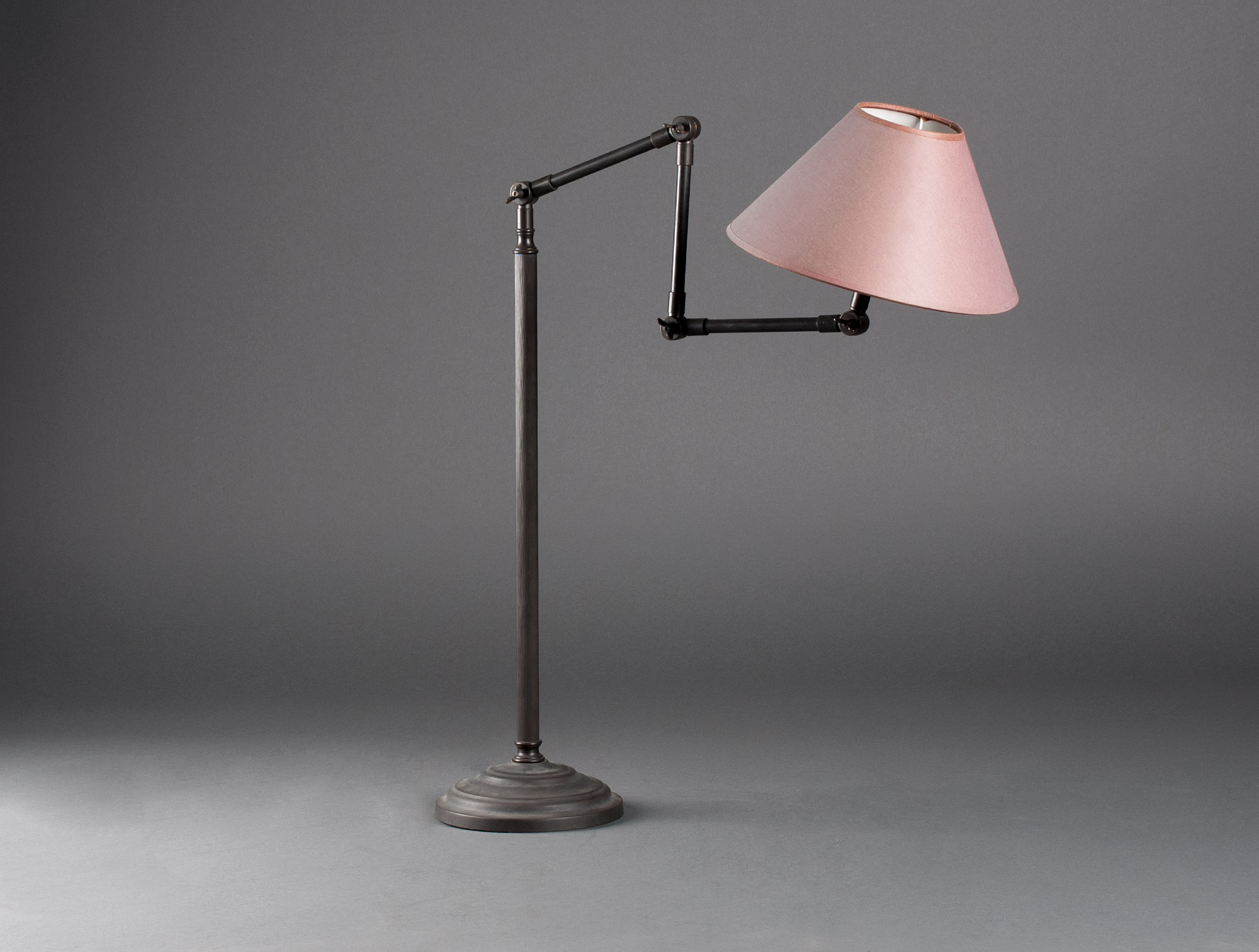 Large lamp black wrought iron hinge for varying height, topped with a lampshade in pink silk, circular base, arm twentieth century .