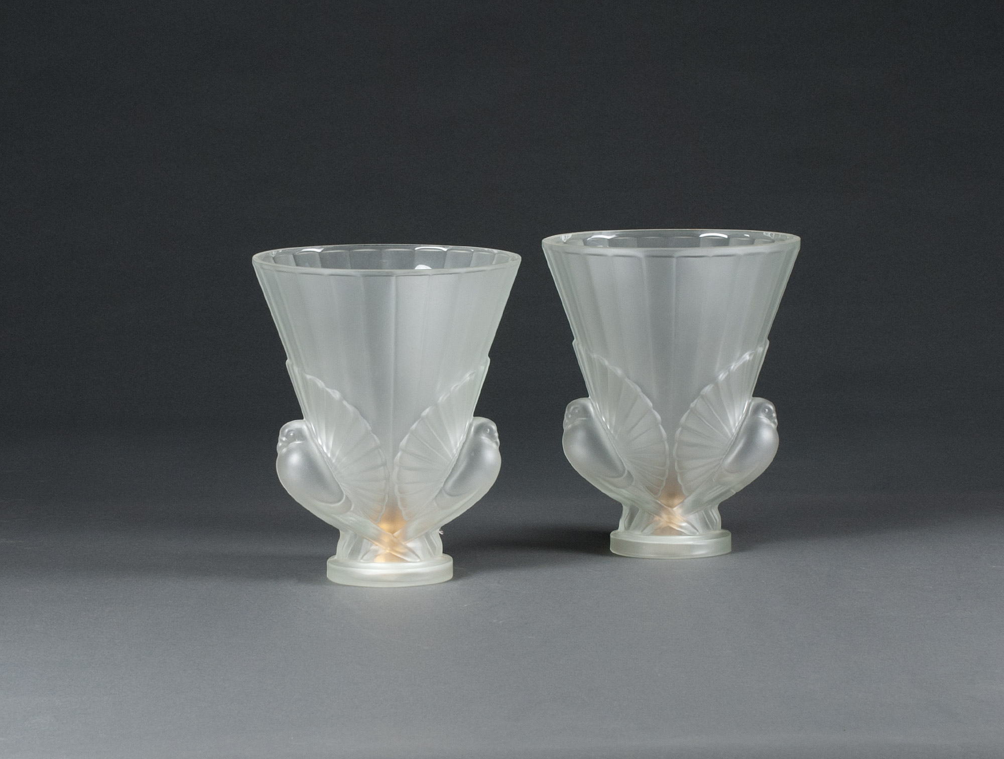 Pair of molded glass bowls , decorated with doves way Lalique, 1900 .