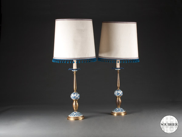 Pair of candles mounted lamp gilt metal and decorated faience delft , decor items turned in late nineteenth century.