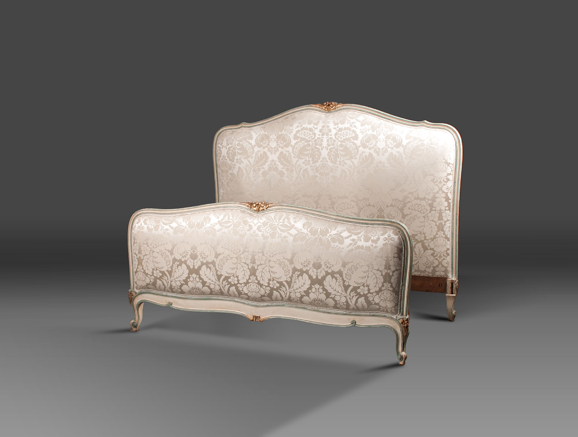 Louis XV style bed nets painted blue gray shell golden beige silk damask