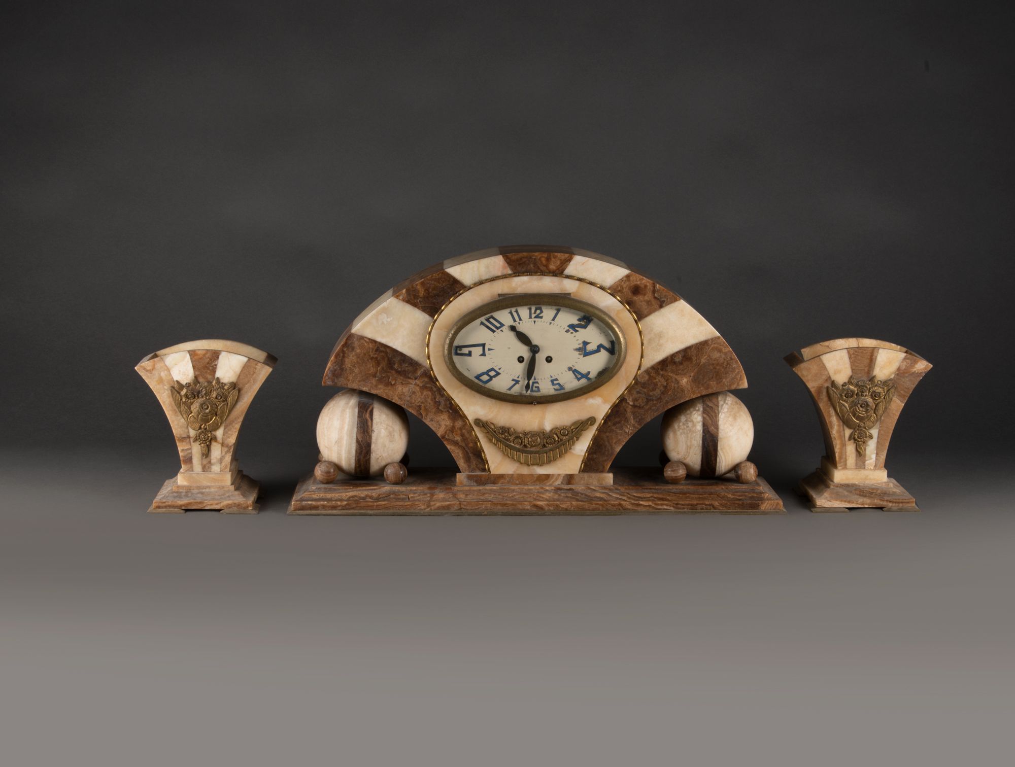 Pendule 1930 marbre 2 tons décor 2 boules + 2 cassolettes assorties marbre 2 tons(80)