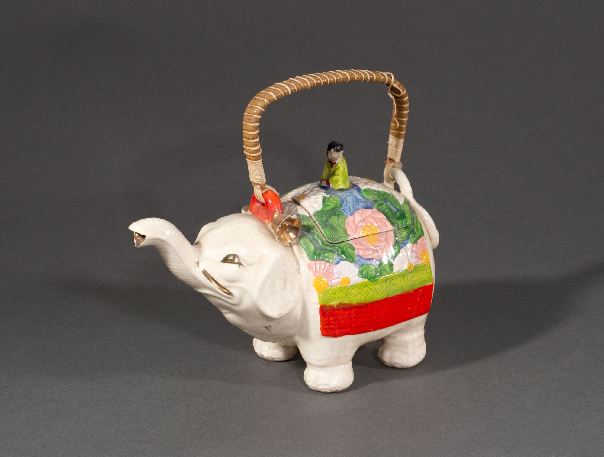 Théière éléphant faïence craquelée blanc et polychrome +couvercle