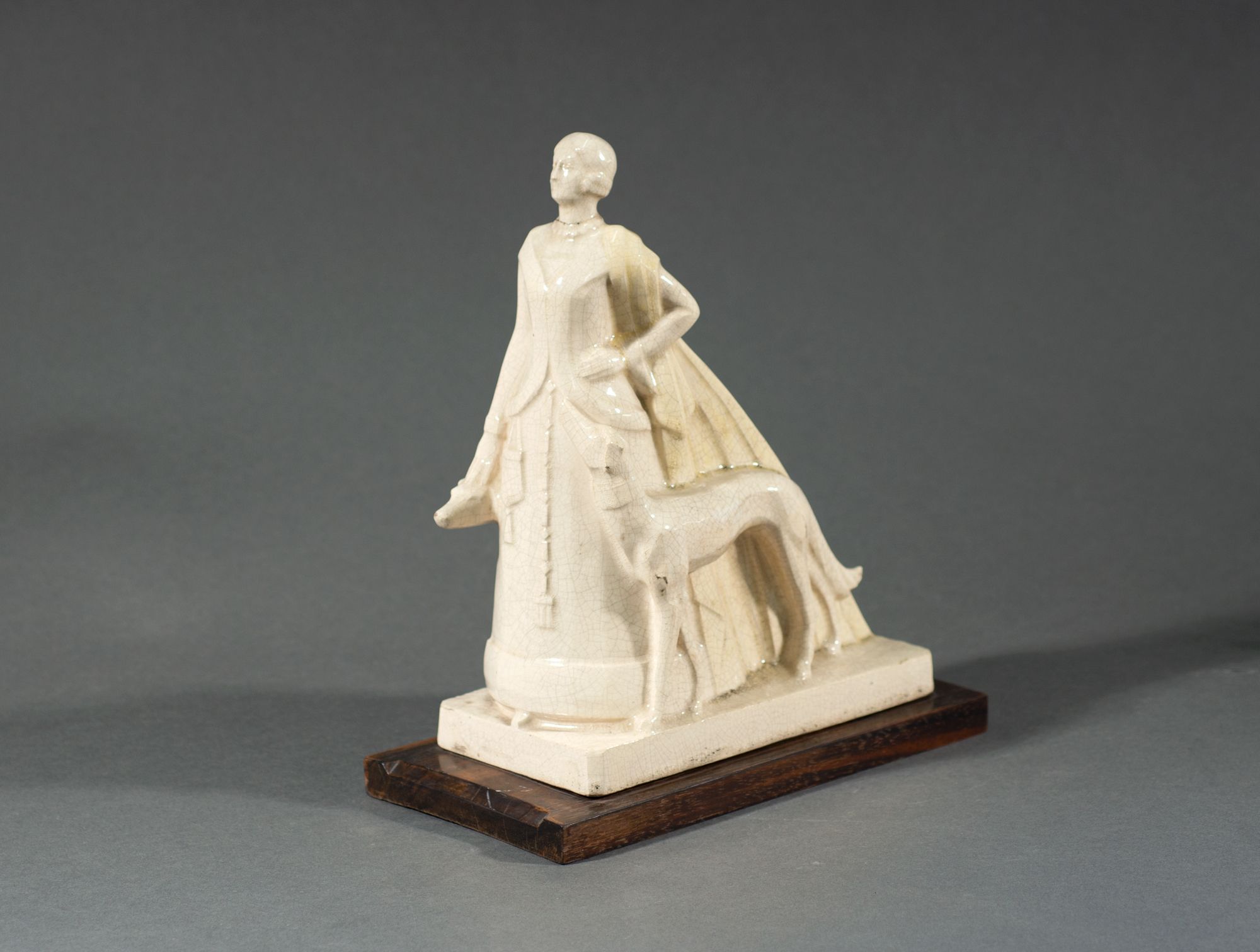 Sujet 1930 femme aux lévriers faïence blanche craquelée socle bois