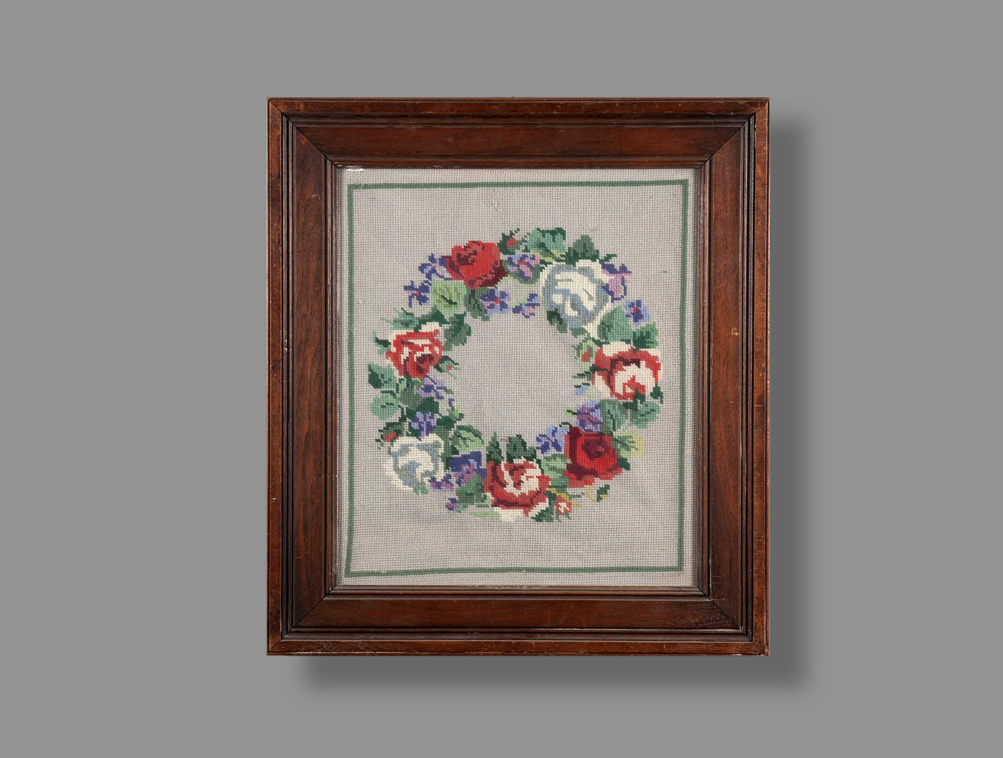Tapestry with a wreath of red and white flowers with foliage, wood frame, XIX .