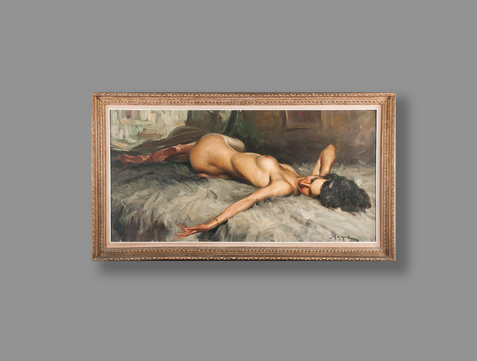 Table model lying on gray feathers, Togo - Durando , gilt frame , 1910 .