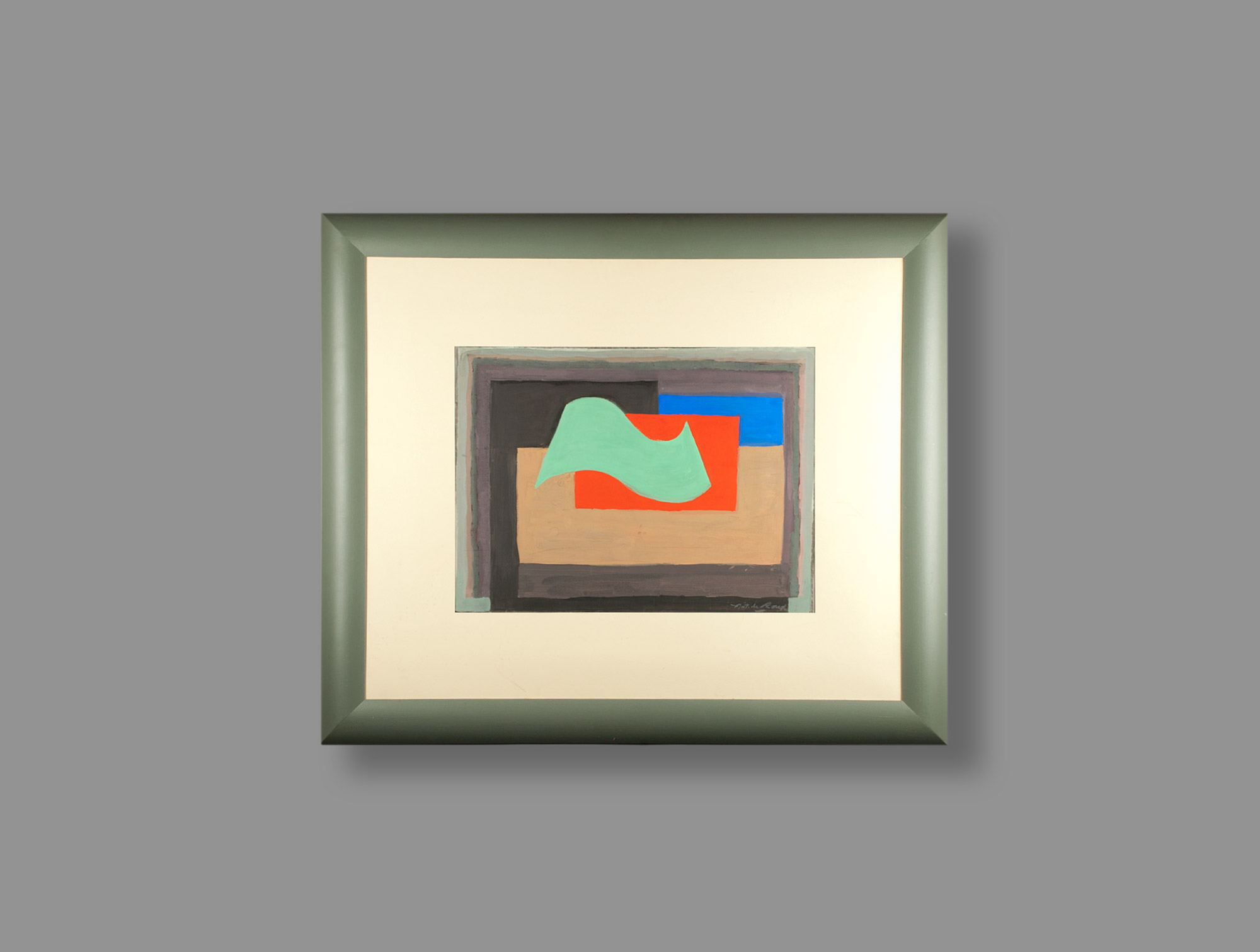 Abstract gouache by De Roux surrounded by a modern frame, 1940.