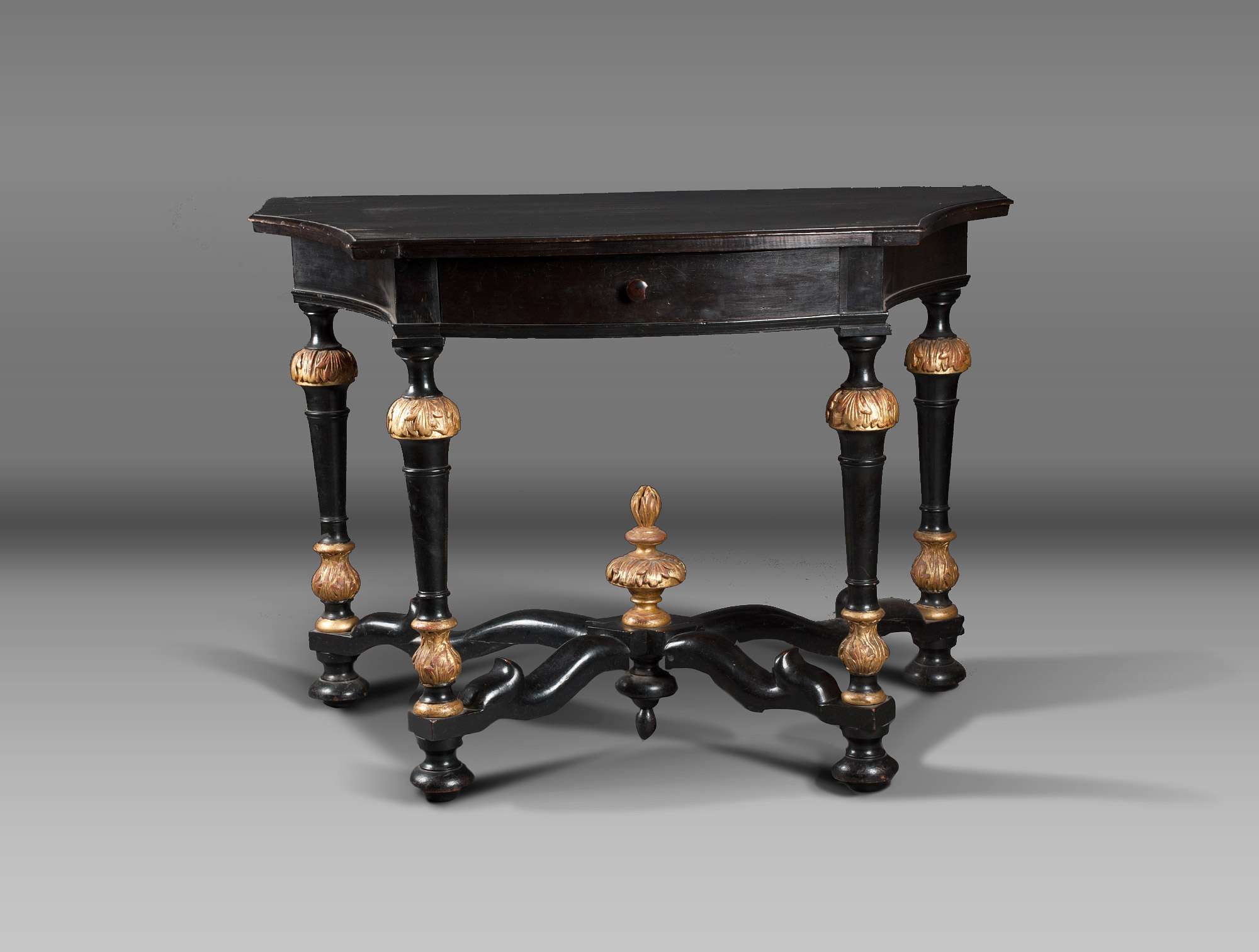 Console table with one drawer and a spacer blackened wood and golden parts , XIX .