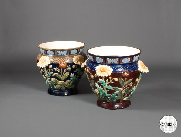 Two large earthenware flower pots decorated with large daisies and blue butterflies , XIX .