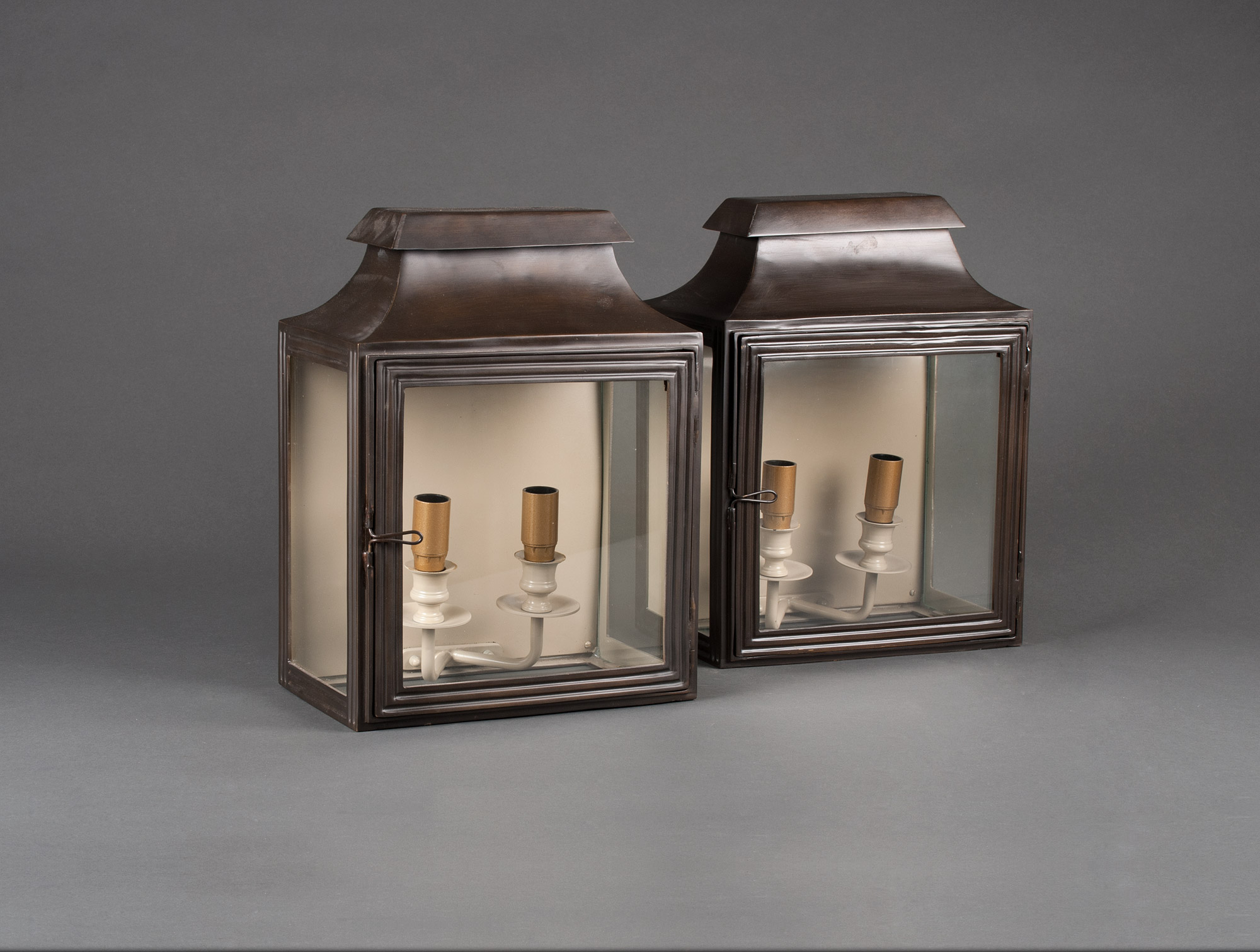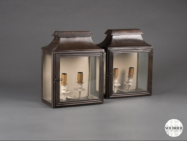 Deux petites lanternes murales en métal et en verre à deux bras de lumières, XXe.