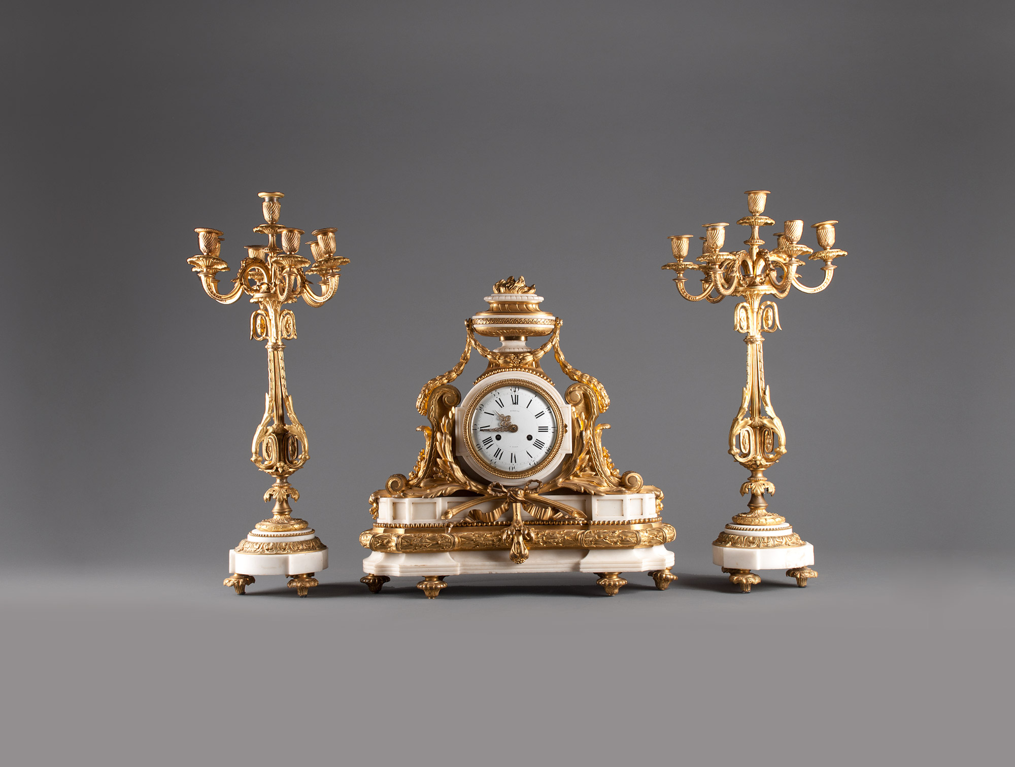 Paire de candélabres en bronze doré et ciselé, base en marbre reposant sur pieds en bronze doré. Cette paire fait partie d'une garniture de cheminée. XVIIIe siècle, Louis XVI.