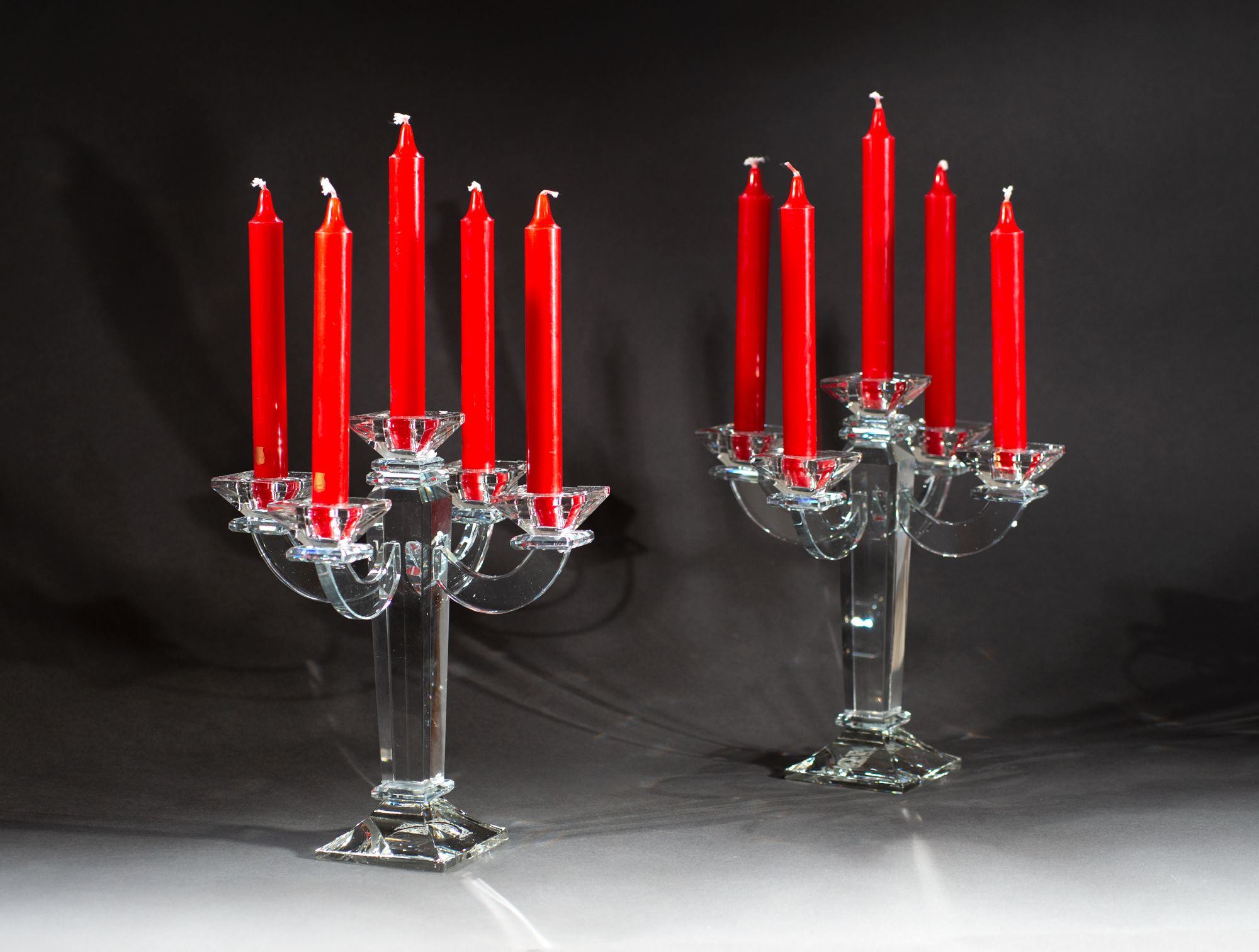 Deux chandeliers en verre cinq branches