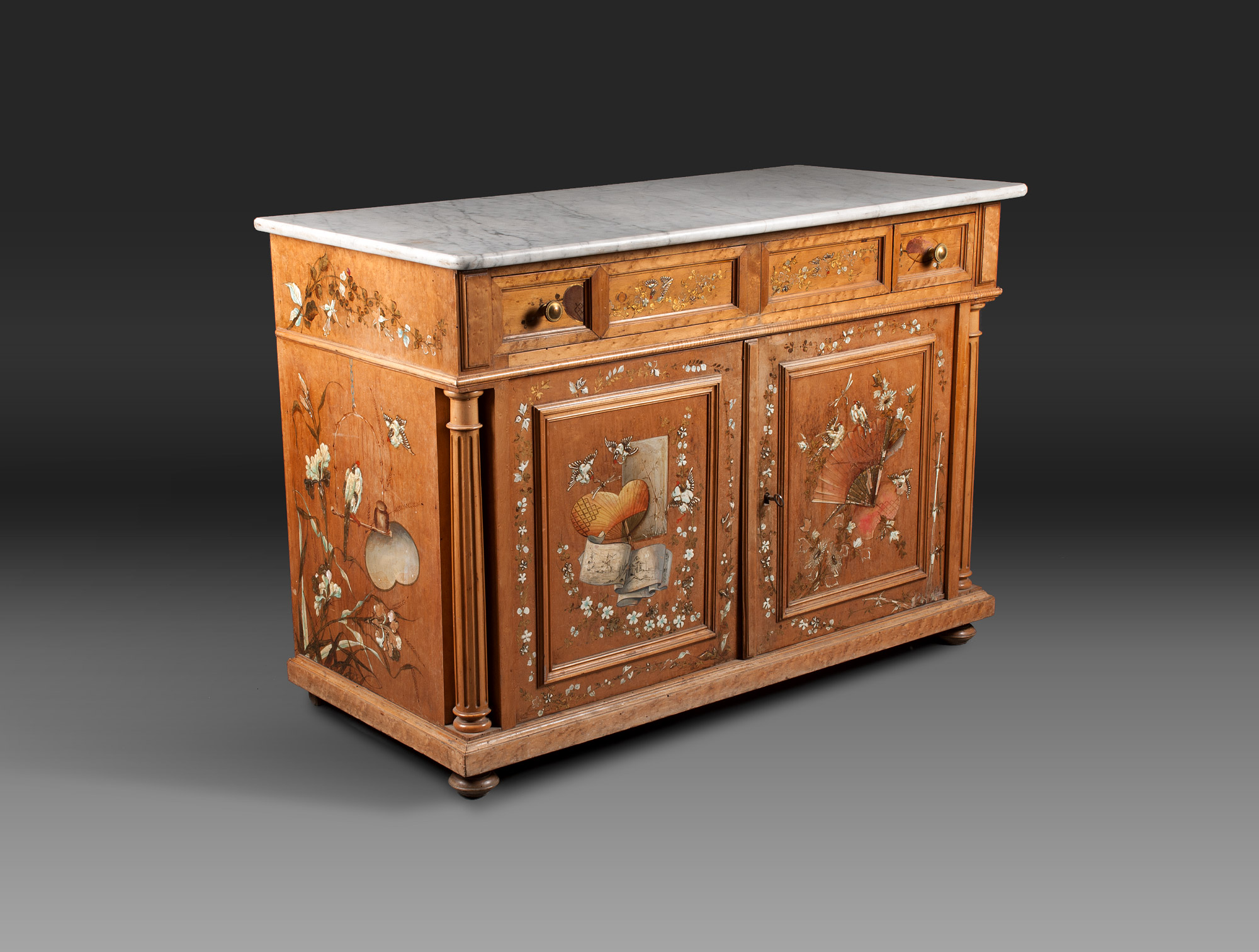 Petit bahut en chêne à décor polychrome de fleurs, dessus en marbre blanc supporté par une ceinture à tiroirs ouvrant sur deux portes décoré de colonnes cannelées reposant sur des pieds boules, Louis XVI, fin XVIIIe.