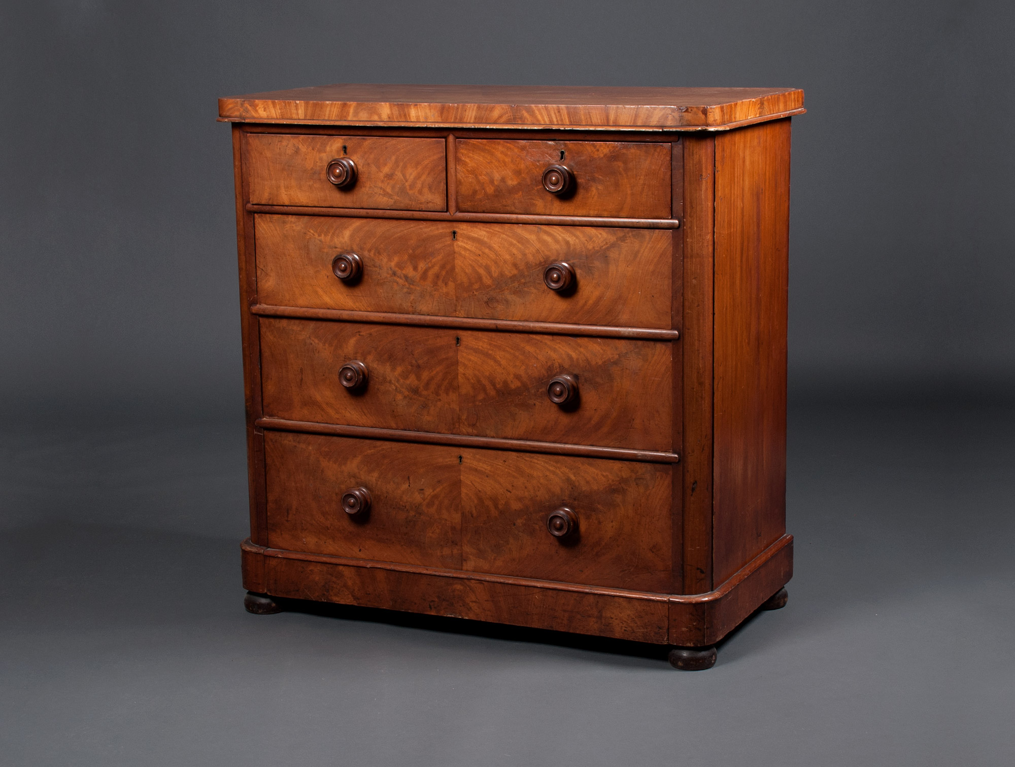 Commode anglaise en acajou, ouvrant sur deux petits tiroirs en ceinture et trois tiroirs, ornés de poignées macaron, reposant sur des pieds boules, XIXe, Angleterre.