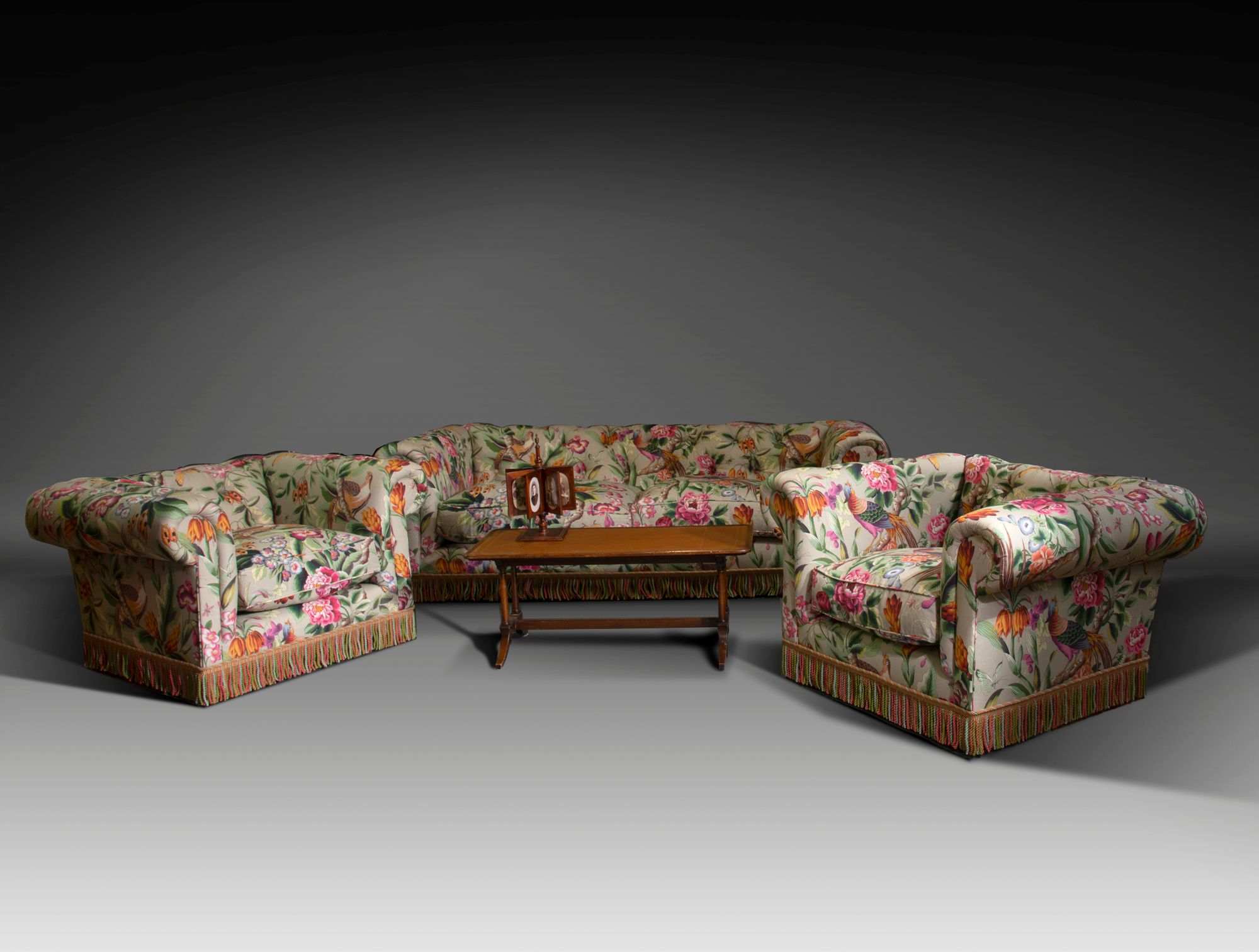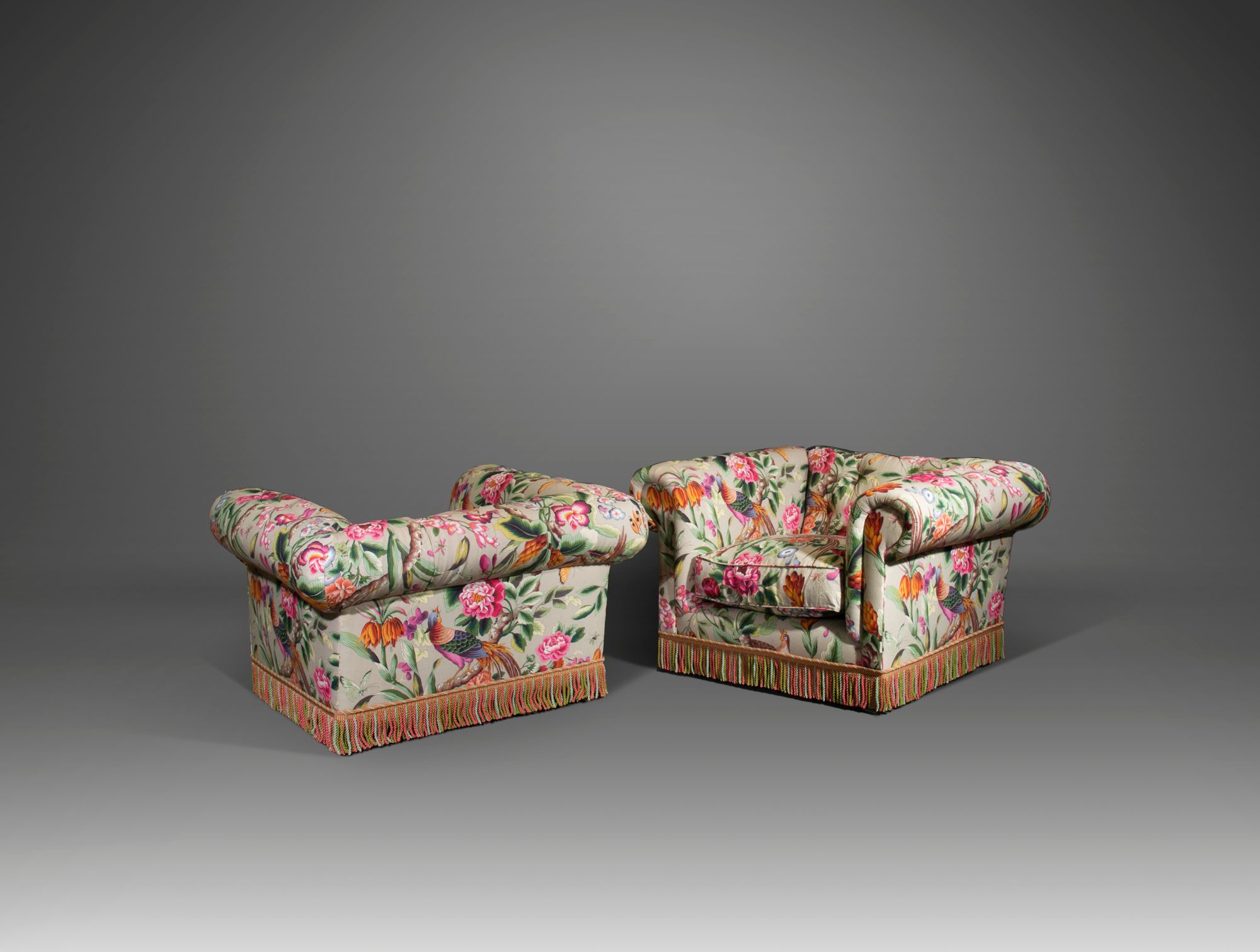 Deux fauteuils Chesterfield Yesterday en tissu gris capitonné.