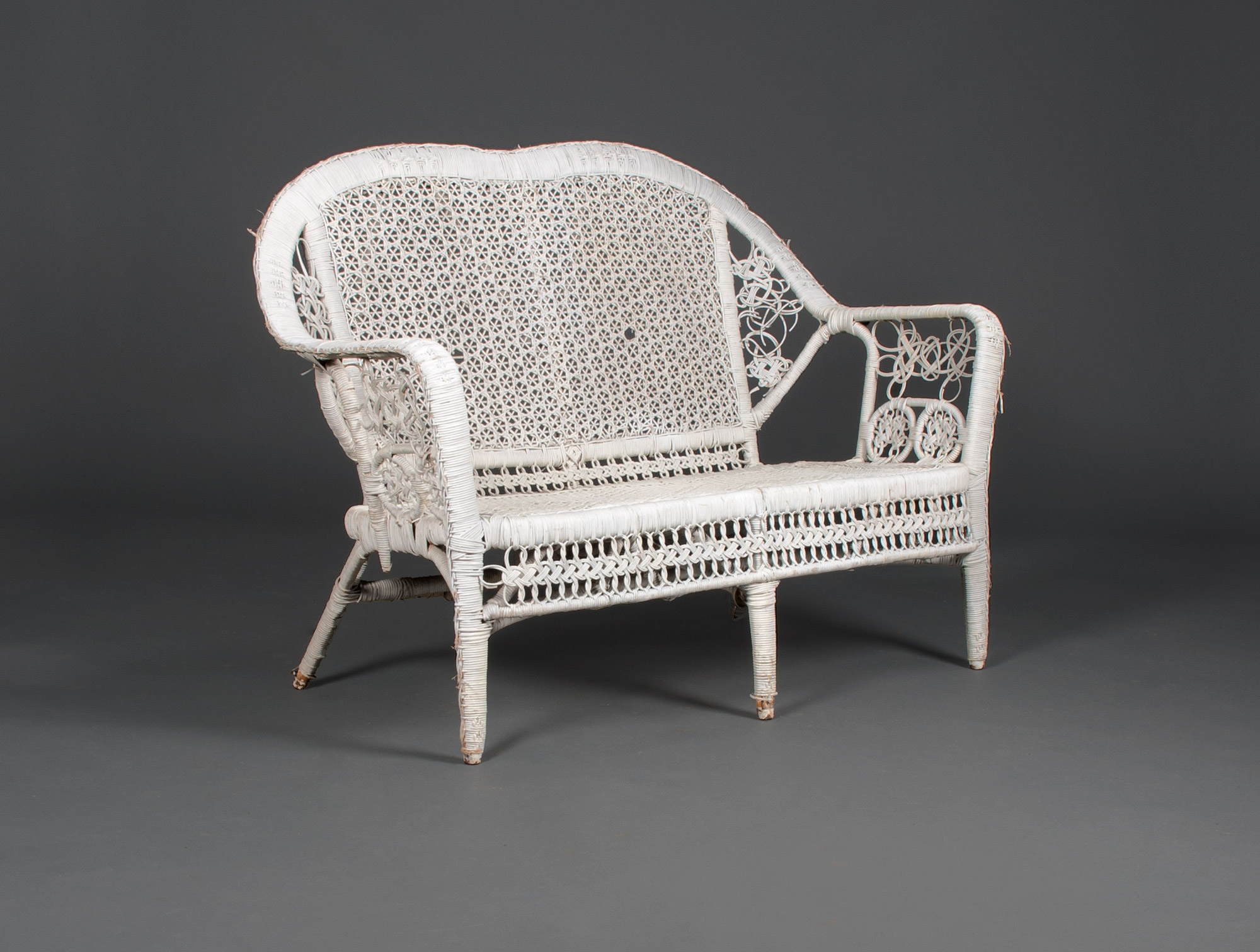 Salon de jardin en osier blanc : 1 canapé, 2 fauteuils, 1 table basse.