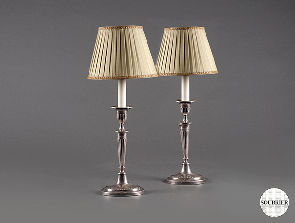 Paire de bougeoirs montés en lampes, en métal argenté, de style néoclassique, fût cannelé et base orné de palmettes, XIXe siècle.