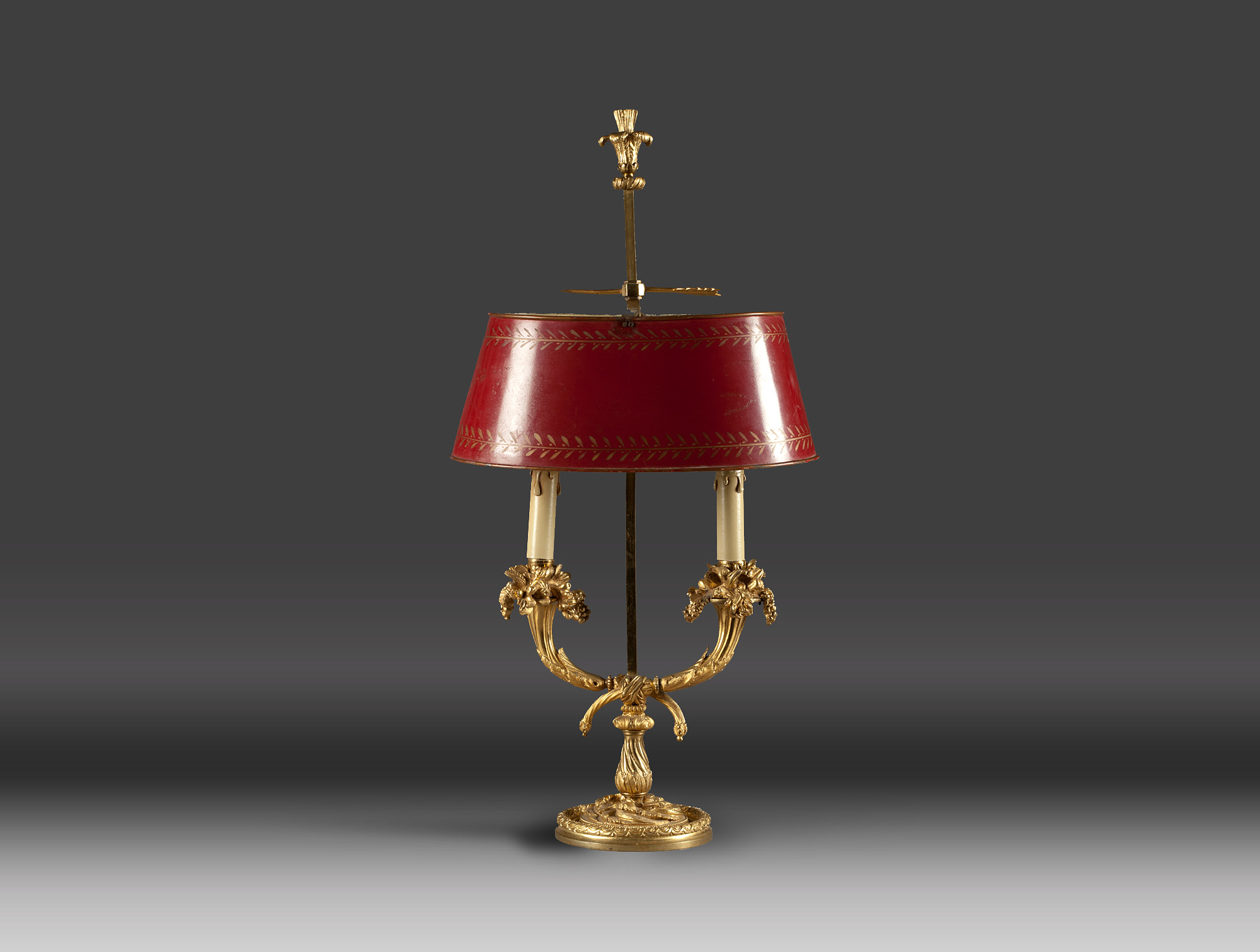 Lampe bouillotte en bronze doré en forme de corne d'abondance à 2 lumières avec un abat-jour en tôle rouge, style Louis XV.