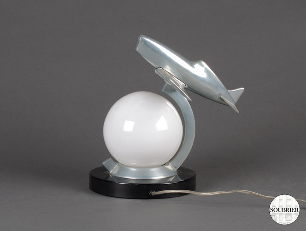 Lampe à sphère lumineuse en opaline et à décor d'avion sur socle noir, XXe.