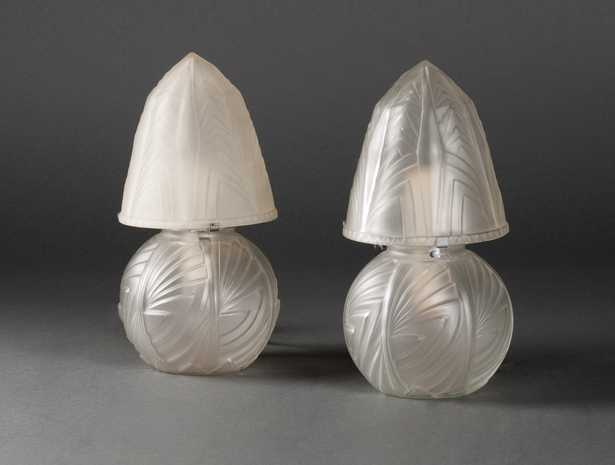 Paire de lampes en pâte de verre moulé à décor géométrique, base en forme de boule et abat-jour en cloche, 1900.