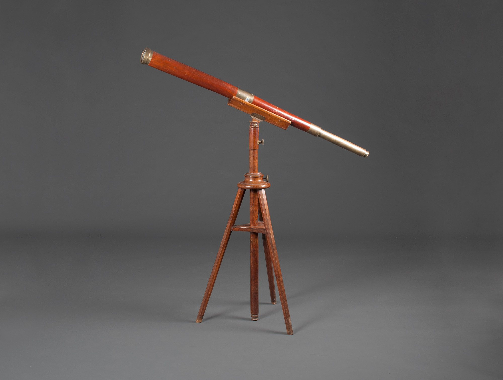 Longue vue en acajou bagué de laiton, hauteur variable, reposant sur un piétement tripode, XIXe.