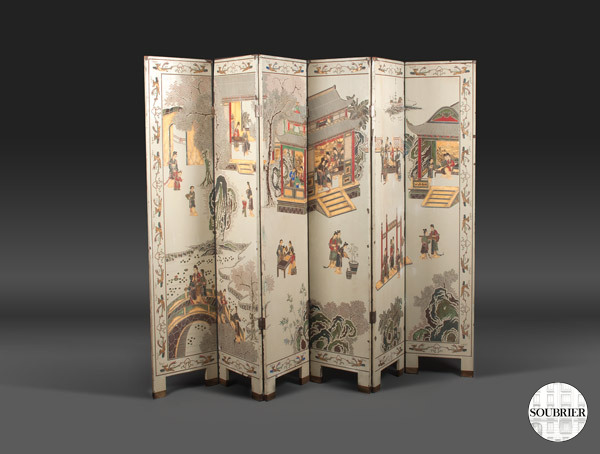 Paravent chinois réversible à six feuilles laquées vert d'eau et décorées de scènes de personnages chinois, XIXe - Chine.