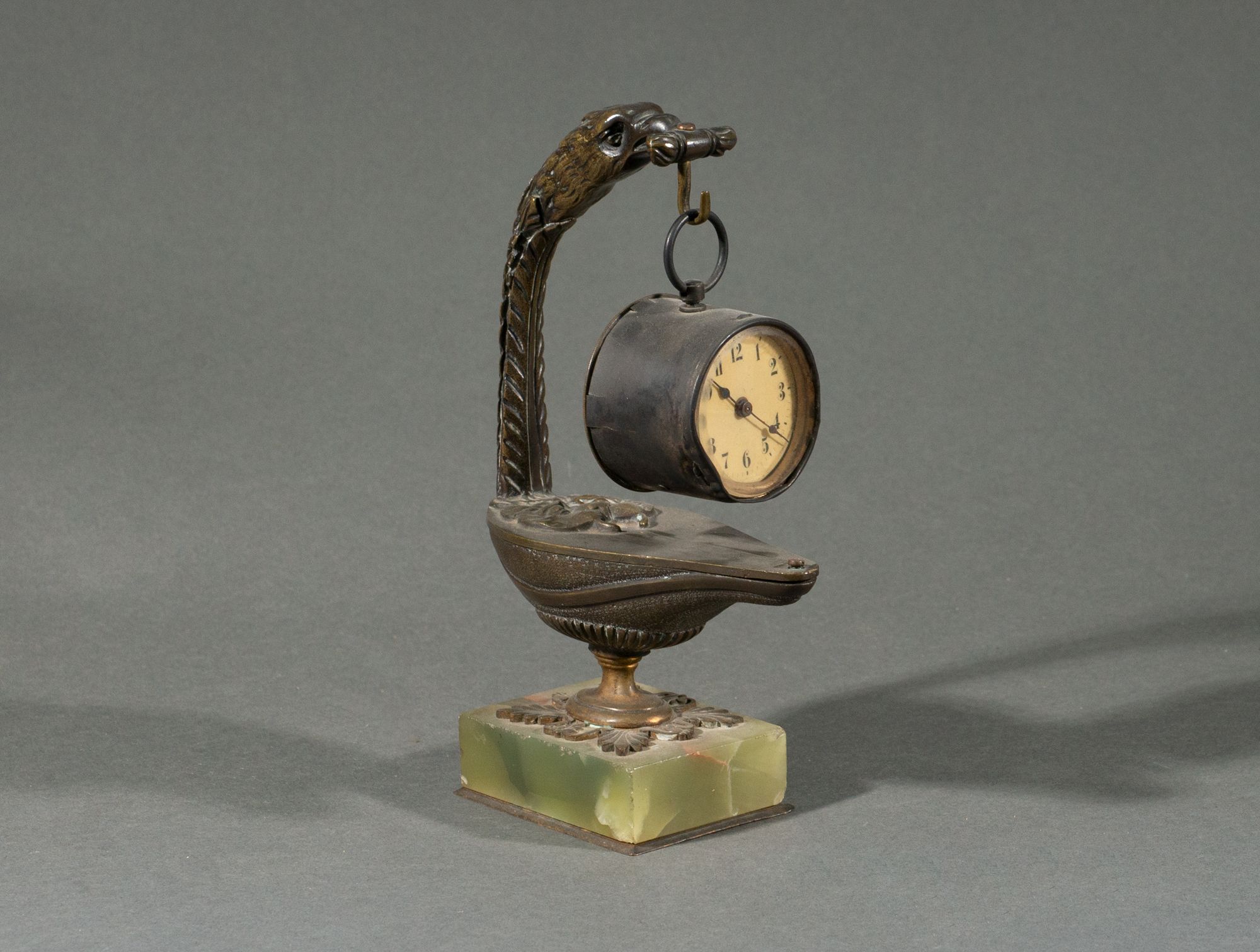 Pendulette cylindrique petit modèle sur support directoire en bronze et marbre avec oiseau