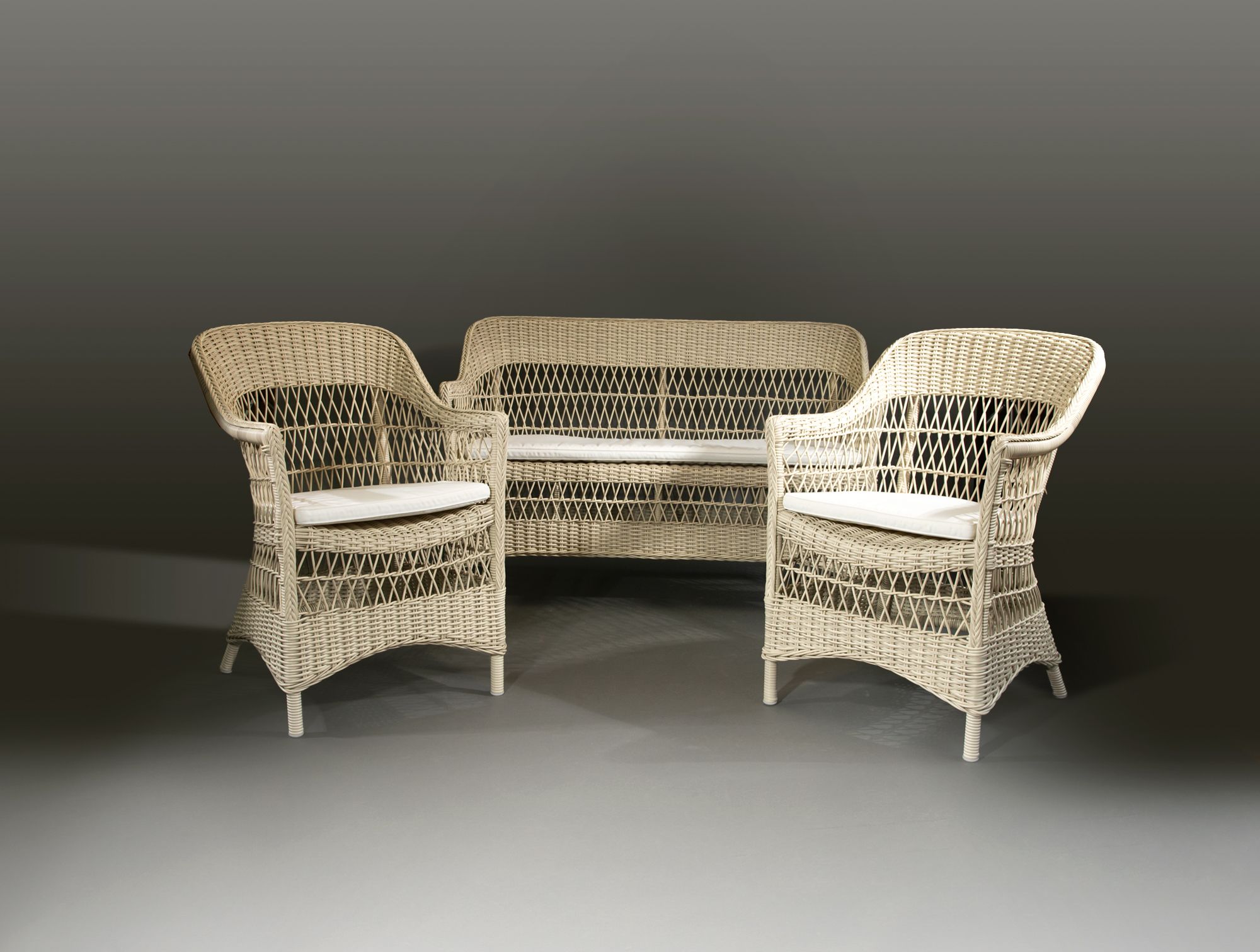 Salon de jardin en rotin blanc cassé : 1 canapé; 2 fauteuils et 1 table.