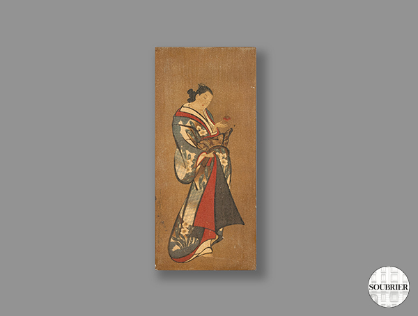 Panneau de bois japonais avec une courtisane japonaise au long manteau coloré, sans cadre, XXe.