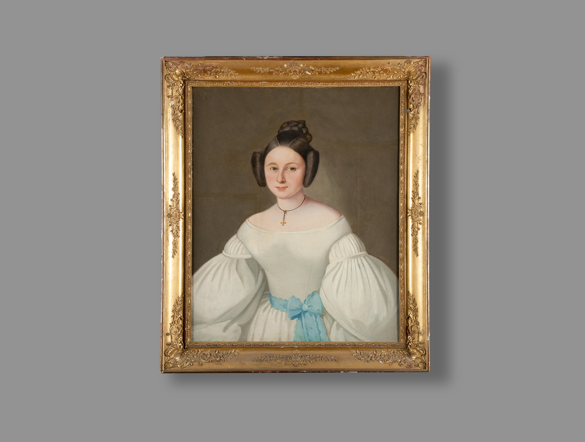 Portrait d'une jeune fille romantique portant une robe blanche à la ceinture bleue, cadre doré, XIXe.