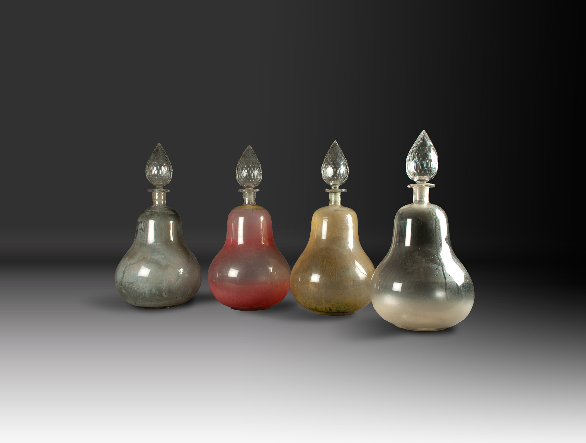 Quatre grands flacons à pharmacie décorés de gros bouchons en gouttes d'eau, XIXe.